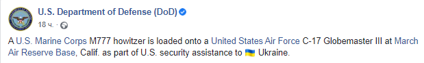 "Гаубица М777 Корпуса морской пехоты США загружена на самолет C-17 Globemaster III Военно-воздушных сил США на авиабазе Марч, Калифорния, в рамках помощи США в обеспечении безопасности Украины", — сказано в нем.