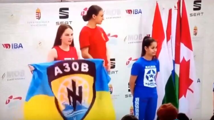 Украинская спортсменка подняла флаг Азова на турнире по боксу в Венгрии. Скриншот из видео
