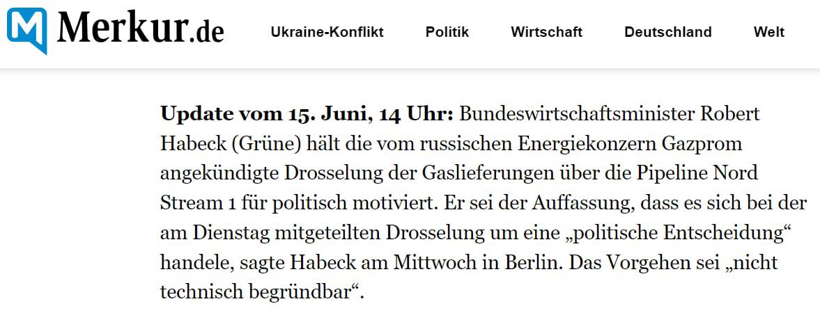 В Германии считают такие действия РФ "политически мотивированными", заявил федеральный министр экономики Германии Роберт Хабек (Зеленые).