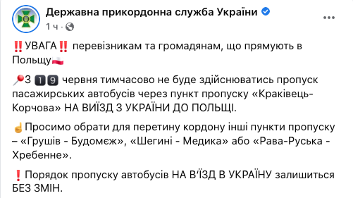 Пограничный пункт пропуска "Краковец" на границе с Польшей с 19 июня временно перестанет пропускать из Украины автомобили и автобусы.