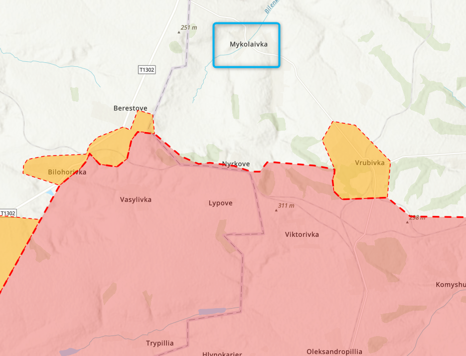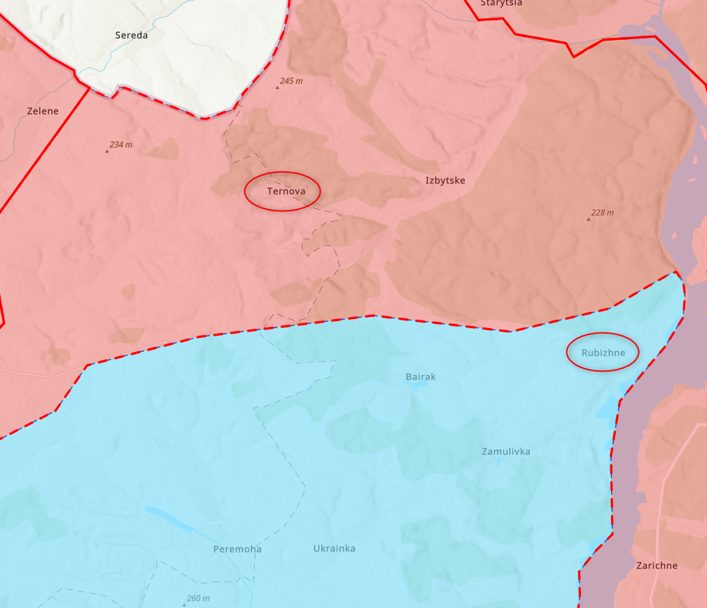 Российские телеграм-каналы пишут, что Рубежное уже захвачено, но украинский Генштаб, как видим, этого не подтверждает. Также россияне сообщали, что взяли под контроль Терновую около границы с Россией. На картах Института изучения войны Терновая уже в зоне российского контроля, а Рубежное нет.