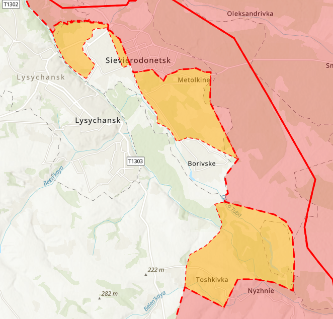 Ведутся бои в направлении трассы Лисичанск - Бахмут к северо-западу от Попасной. Была попытка наступления от захваченной Врубовки в сторону Николаевки, но она, по данным Генштаба ВСУ, была отбита. Также к Николаевке прорываются со стороны Нырково, бой продолжается.