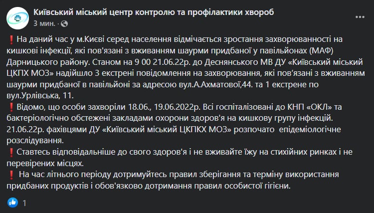 Киевский городской центр контроля и профилактики болезней назвал адреса ларьков с шаурмой, где зафиксированы отравления сальмонеллезом.