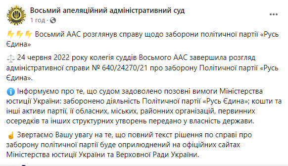 "Информируем о том, что судом удовлетворены исковые требования Министерства юстиции Украины: запрещена деятельность Политической партии "Русь Единая"; средства и другие активы партии, ее областных, городских, районных организаций, первичных организаций и других структурных образований переданы в собственность государства", - говорится в сообщении.
