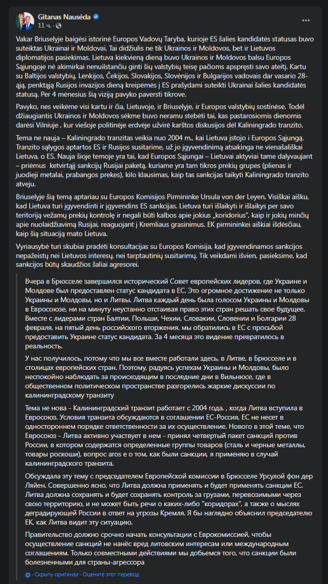 "Литва должна применять и будет применять санкции ЕС. Литва должна сохранять и будет сохранять контроль за грузами, перевозимыми через свою территорию, и не может быть речи о каких-либо "коридорах" в ответ на угрозы Кремля", – написал Науседа в Facebook.