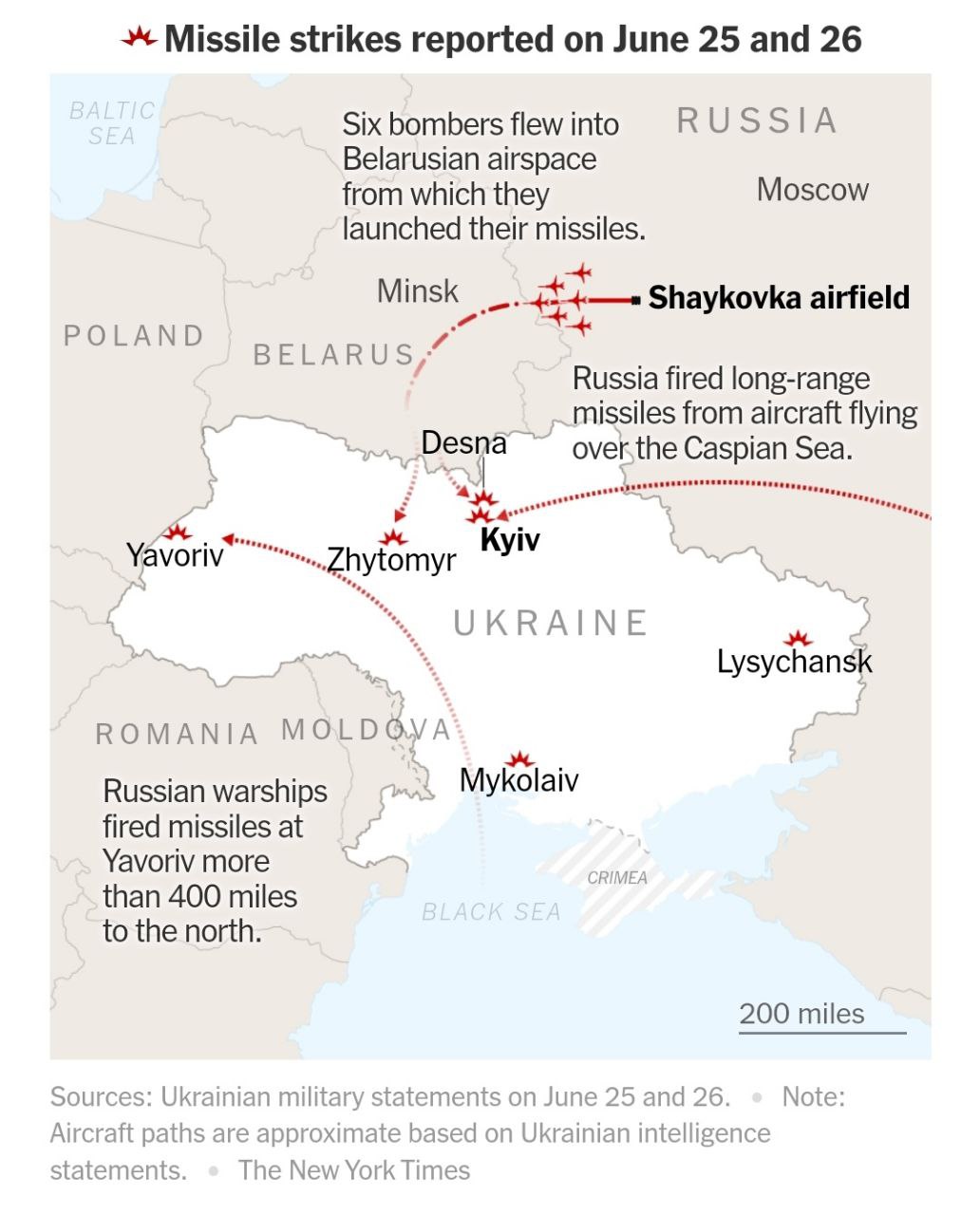 08.15 New York Times публикует карту обстрелов Украины за выходные 25-26 июня. На ней показаны места прилетов и направления, с которых запускались ракеты.