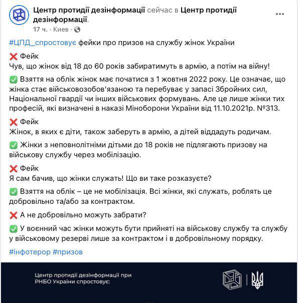 Центр противодействия дезинформации СНБО опроверг информацию о принудительной мобилизации женщин в ВСУ