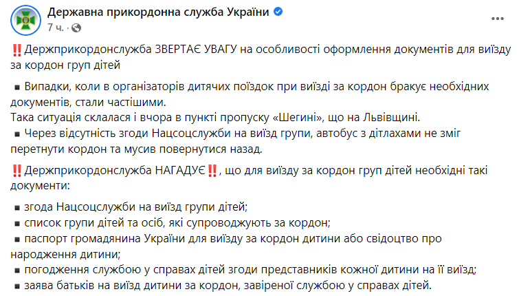 Госпогранслужба напоминает, что для выезда за границу групп детей необходимы следующие документы: