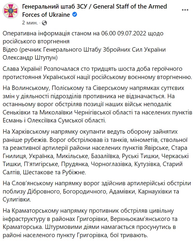 Война в Украине продолжается уже 136-й день. "Страна" следит за происходящим 9 июля в обновляемом материале.