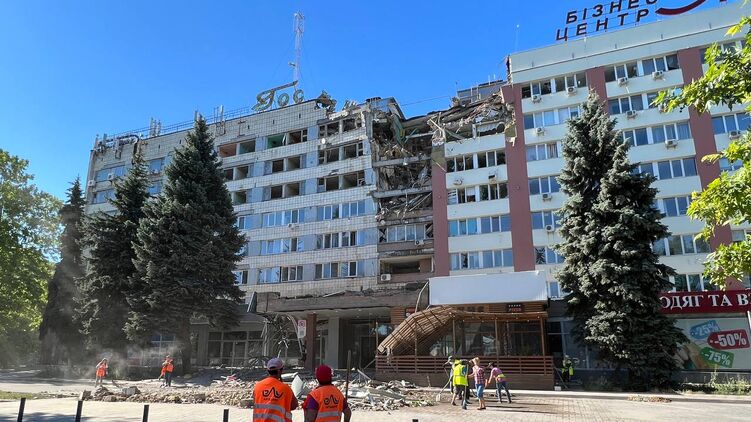Утром в четверг, 14 июля, россияне во время обстрела Николаева разбомбили отель "Николаев", обломками повреждено здание ТРЦ напротив. На месте работают коммунальщики.
