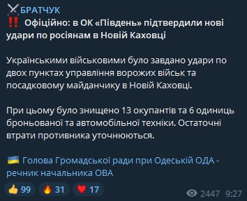 Украинские военные нанесли удары по двум пунктам управления войск противника в Новой Каховке.