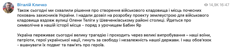 В Киеве рядом с урочищем Бабий Яр создадут военное кладбище и места почетных захоронений защитников Украины, погибших на войне против России.