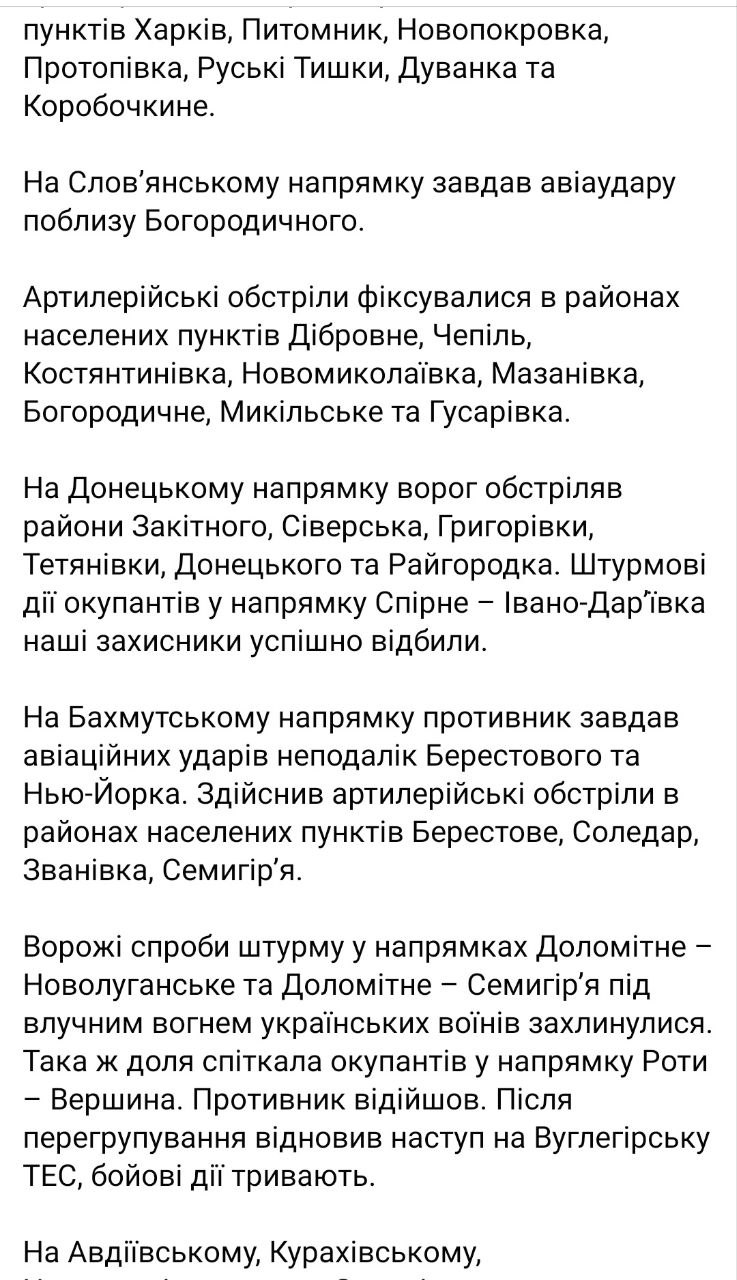 1. Отбито наступление россиян из Спорного на Ивано-Дарьевку юго-восточнее Северска (Донецкая область).