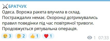 07.37 В Одессе ракета попала по складу, сообщил спикер ОВА Сергей Братчук.