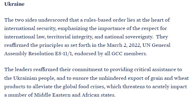К слову, обязательств Саудовской Аравии нарастить добычу нефти, чтобы она стала дешеветь (то, зачем собственно и приезжал Байден) в итоговом заявлении не звучит.