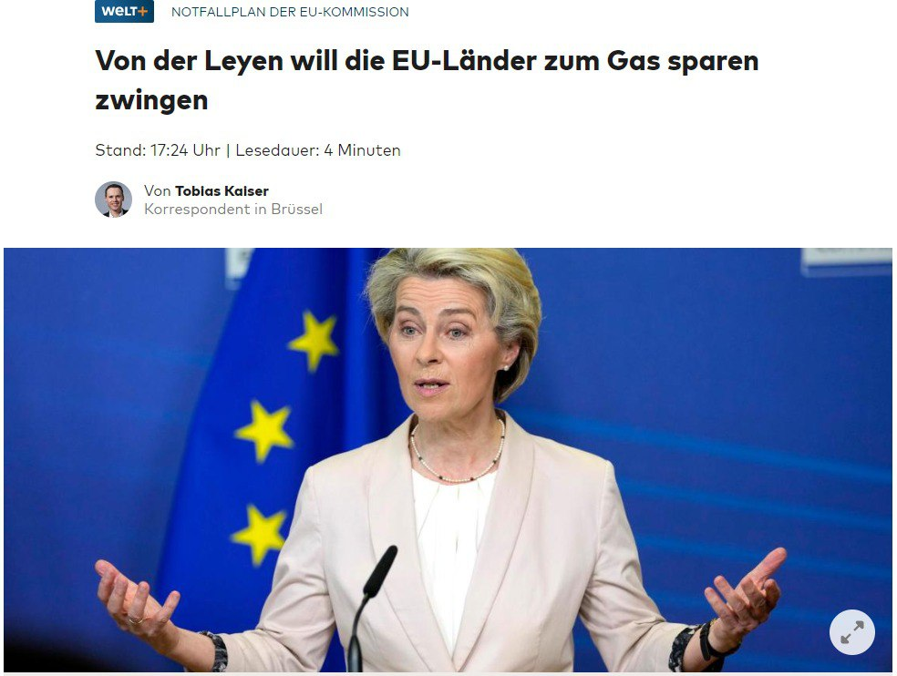 "Если хозяйства и компании в странах-членах добровольно не накопят достаточные объемы газа, а ситуация со снабжением значительно ухудшится, то Брюссель без консультаций с национальными правительствами установит целевые показатели по экономии, которые национальные правительства должны выполнить", - пишет издание.