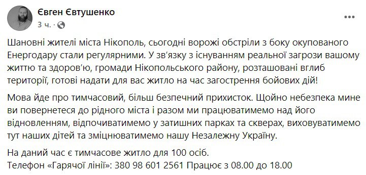 "В связи с существованием реальной угрозы вашей жизни и здоровью, громады Никопольского района, расположенные вглубь территории, готовы предоставить для вас жилье на время обострения боевых действий. Речь идет о временном, более безопасном жилище", - отметил Евтушенко.