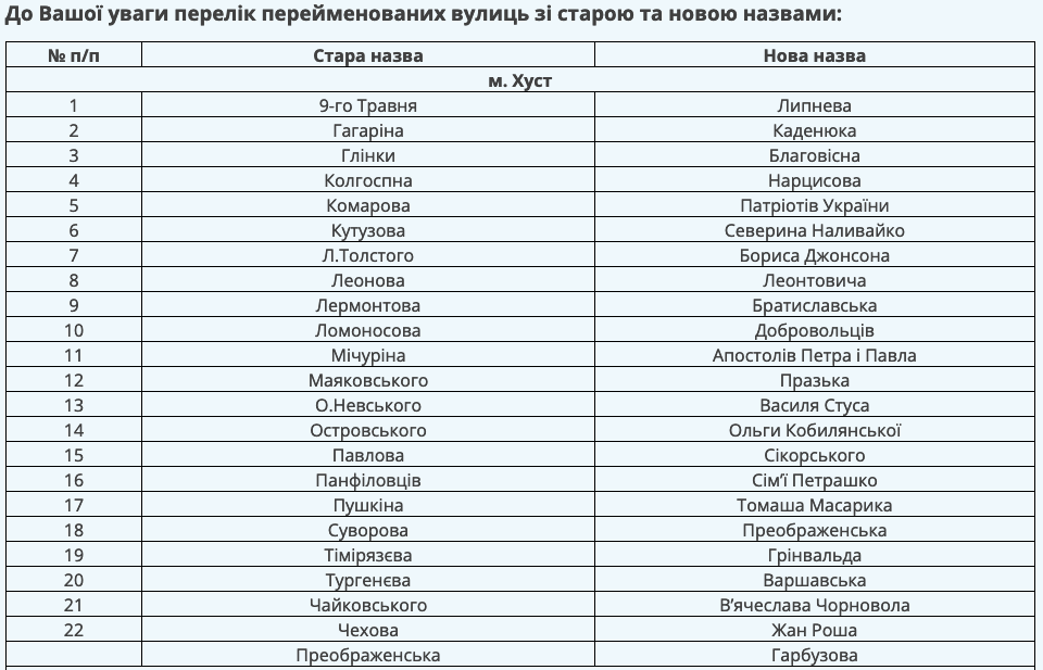 "После ряда заседаний профильной комиссии по переименованию улиц, а также учета мнения историков и ученых и предложений по переименованию местных жителей, на рассмотрение депутатов вынесли новый перечень названий улиц, переулков, площадей, площадей, набережных в г. Хуст и населенных пунктах Хустской территориальной общины", - говорится в сообщении.
