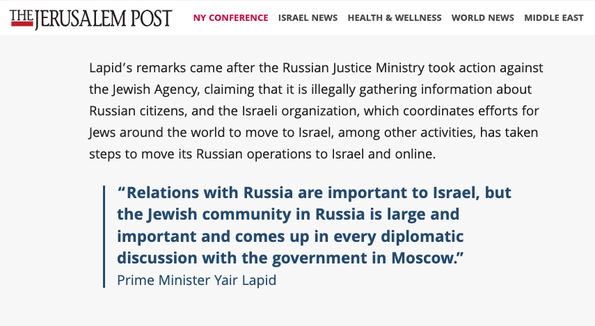 Ранее премьер-минист Израиля Яир Лапид заявлял, что закрытие представительства "Сохнут" повредит отношениям его страны с Россией.