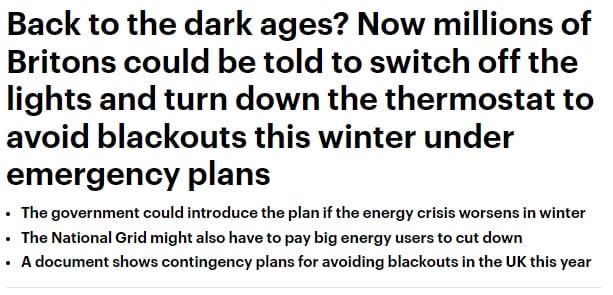 Об этом пишет газета Daily Mail в тревожной статье под названием: "Назад в темные века? Теперь миллионам британцев могут приказать выключить свет и отопление, чтобы избежать отключений электроэнергии этой зимой".