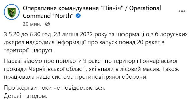 Телеграм-каналы пишут о том, что после этих сообщений были новые взрывы в Черниговской области. И что ракеты летят с территории Зябровки Гомельской области.