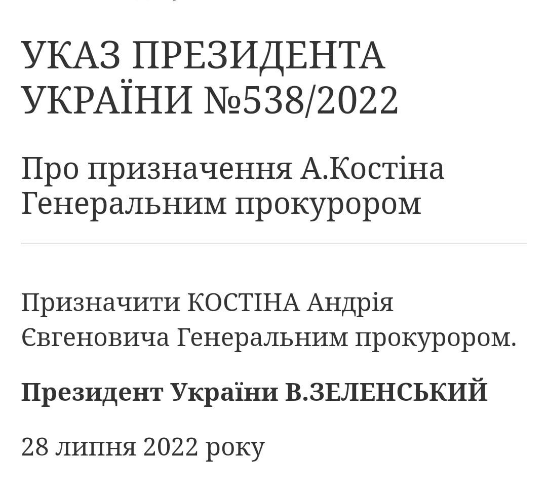 Зеленский подписал указ о назначении Костина новым генпрокурором