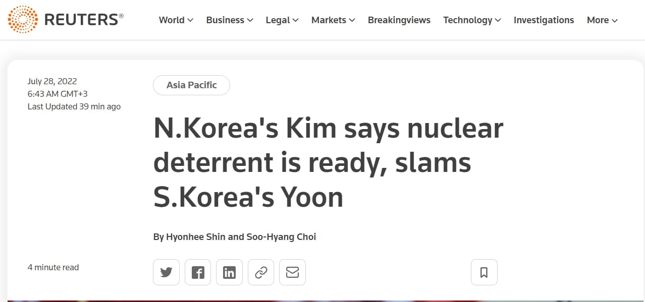 "Наши вооруженные силы полностью готовы к реагированию на любой кризис, и наша национальная система сдерживания ядерной войны также полностью готова верно, точно и быстро мобилизовать свои абсолютные силы для выполнения своей миссии", — сказал Ким.