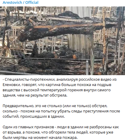 По словам Арестовича, специалисты-пиротехники, анализируя российское видео из Еленовки, говорят, что картина больше похожа на подрыв вещества с высокой температурой горения внутри самого здания, чем на результат обстрела.