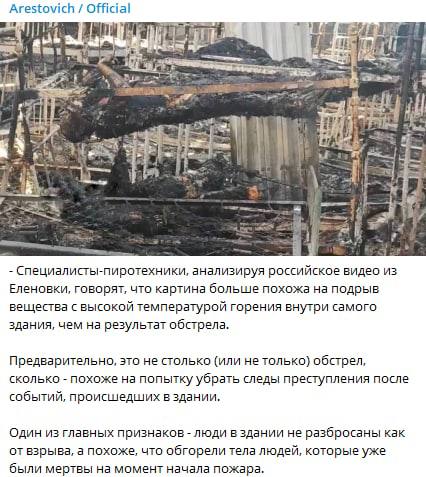 По словам Арестовича, специалисты-пиротехники, анализируя российское видео из Еленовки, говорят, что картина больше похожа на подрыв вещества с высокой температурой горения внутри самого здания, чем на результат обстрела.
