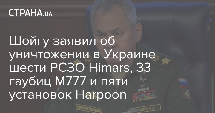 Министр обороны РФ Сергей Шойгу заявил об уничтожении шести пусковых установок и свыше 200 ракет РСЗО Himars, 33 гаубиц М777 и пяти пусковых установок противокорабельного ракетного комплекса Harpoon. Об этом сообщают российские СМИ.
