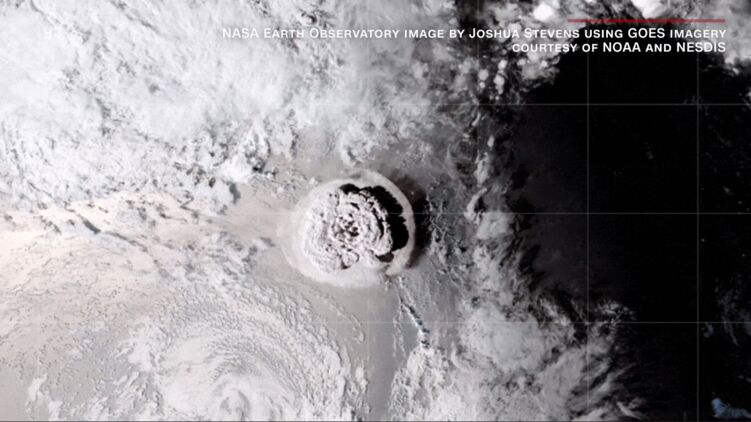 Видео снято со спутника NASA. Сообщается, что вулкан выбросил такое большое количество водяного пара высоко в атмосферу, что это, вероятно, временно нагреет поверхность Земли.