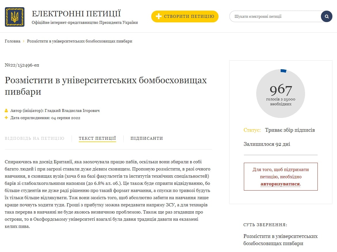 Украинцы создали на сайте президента петицию, в которой предлагают разместить в бомбоубежищах университетов пивбары.