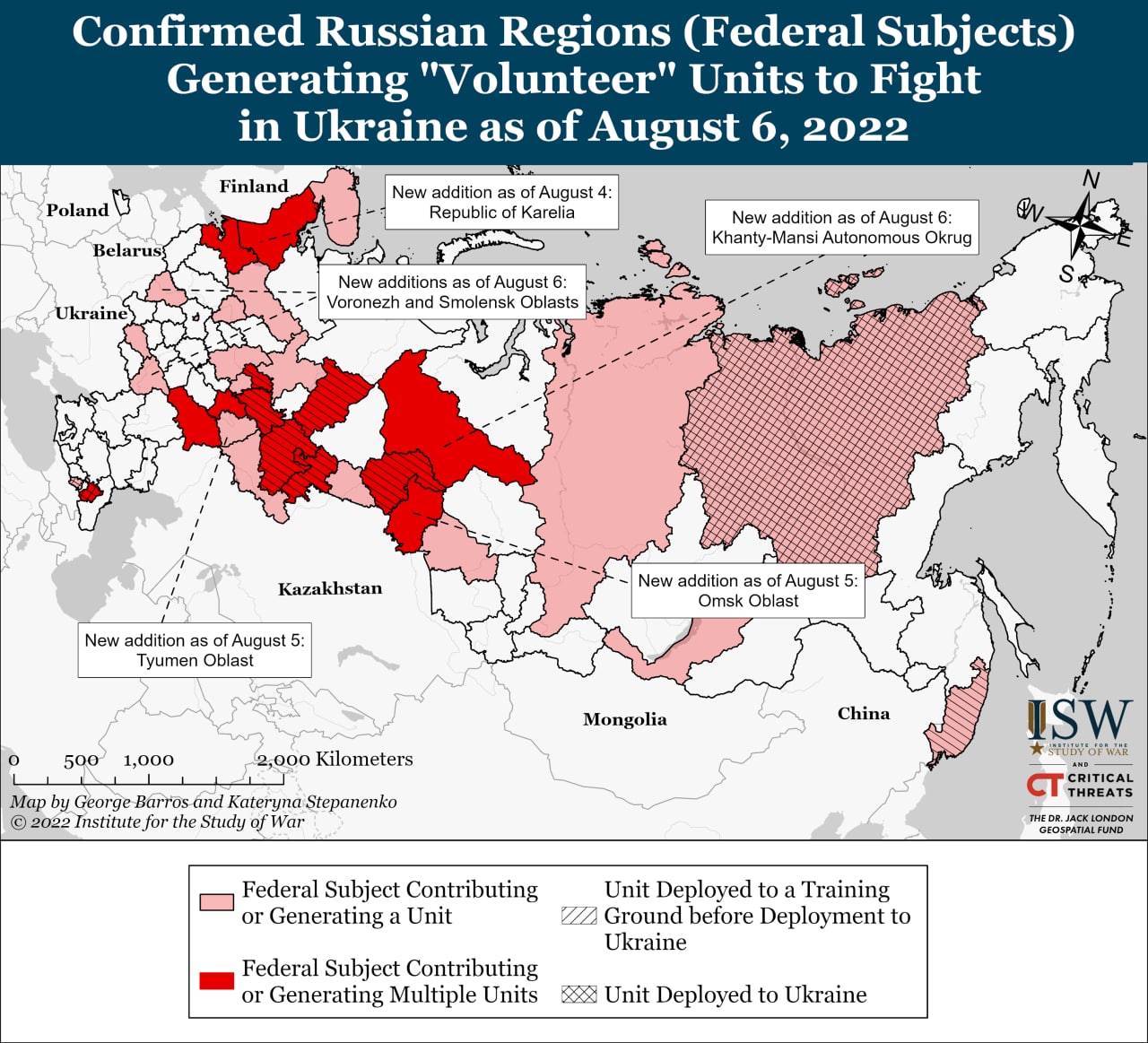 Институт изучения войны (США) публикует карту российских регионов, где подтверждено формирование добровольческих соединений для отправки их на войну в Украине.