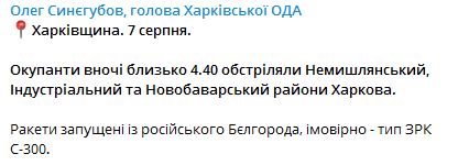 "Ракеты запущены из российского Белгорода, вероятно – тип ЗРК С-300" - говорится в его телеграм-канале.