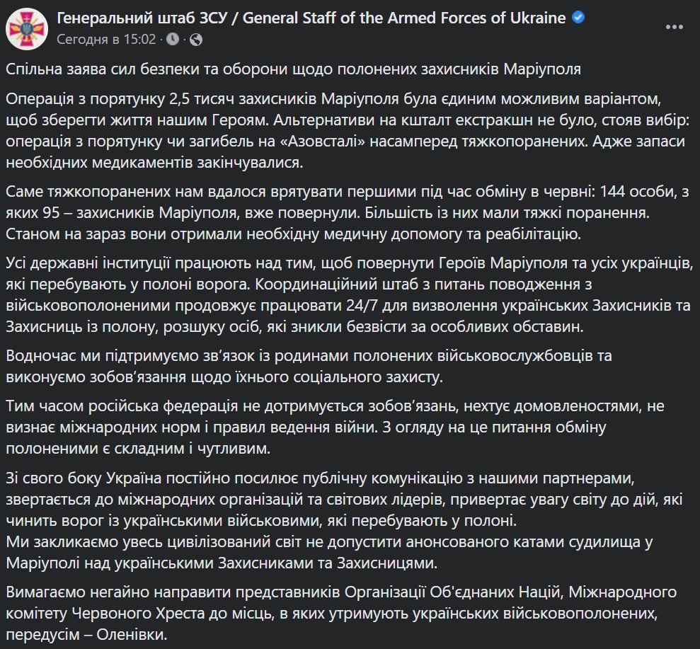 "Все государственные институты работают над тем, чтобы вернуть Защитников Мариуполя и всех, кто находится у врага в плену. Тем временем РФ не придерживается обязательств и пренебрегает договоренностями. Поэтому Украина призывает весь цивилизованный мир не допустить анонсированного судилища в Мариуполе над украинскими Защитниками и Защитницами", - говорится в заявлении.
