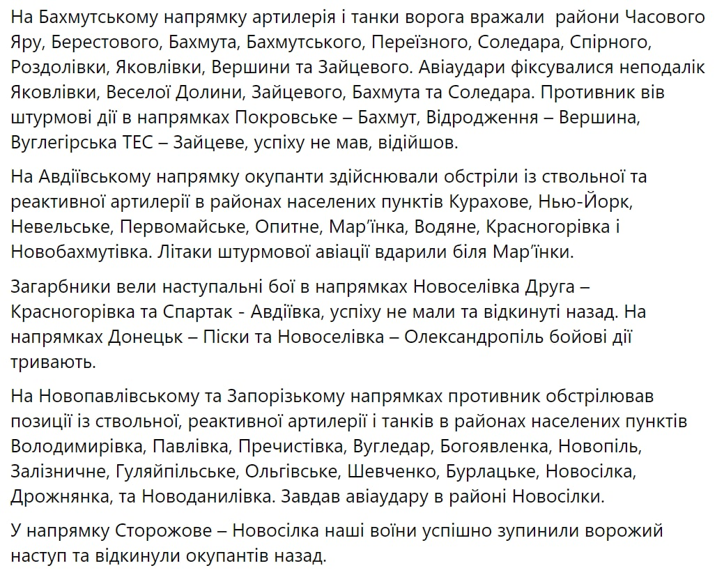 Также "Страна" сообщала, что, по данным Генштаба, ВСУ остановили штурм россиян на Авдеевском направлении. Противник нанес авиаудары неподалеку от Красногоровки, Марьинки, Водяного и Авдеевка. Все вражеские попытки штурма в районах Спартака, Песков и Марьинки наши защитники подавили и отбросили оккупантов на прежние позиции. В то же время в направлении Покровское – Бахмут враг имел частичный успех, пытается закрепиться.