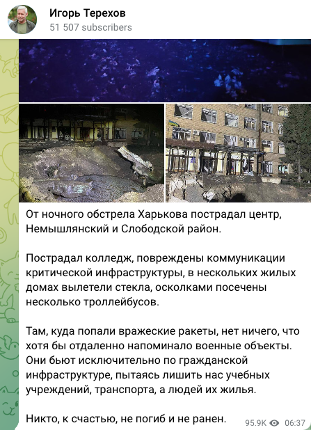 "Там, куда попали вражеские ракеты, нет ничего, что хотя бы отдаленно напоминало военные объекты. Они бьют исключительно по гражданской инфраструктуре, пытаясь лишить нас учебных учреждений, транспорта, а людей их жилья", - пишет Терехов.