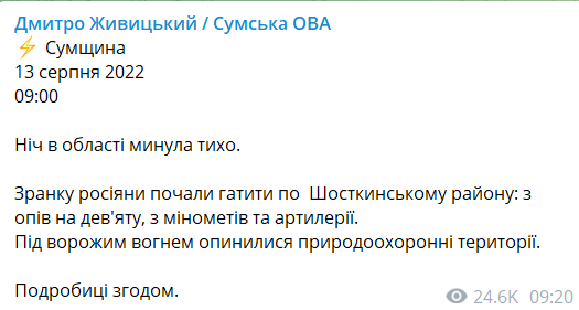 Утро в Сумской области началось с российских обстрелов, при этом ночь в области прошла спокойно.