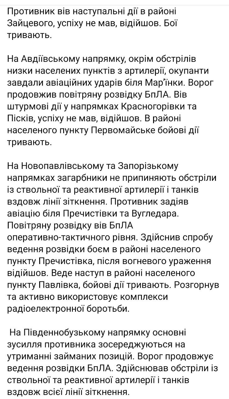 - На Авдеевском направлении, кроме обстрелов ряда населенных пунктов из артиллерии, оккупанты нанесли авиационные удары возле Марьинки. Враг продолжил воздушную разведку БПЛА. Вел штурмовые действия в направлениях Красногоровки и Песков, успеха не имел, отошел. В районе населенного пункта Первомайское боевые действия продолжаются.