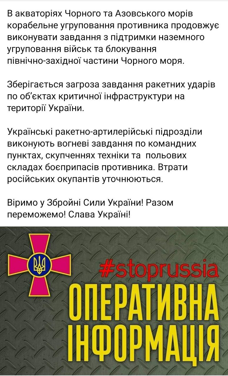 - В акваториях Черного и Азовского морей корабельная группировка противника продолжает выполнять задачи поддержки наземной группировки войск и блокирования северо-западной части Черного моря.