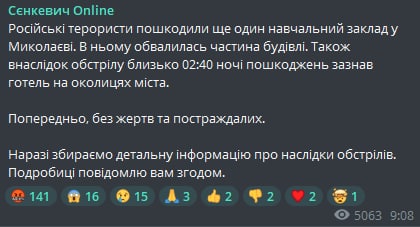09:16 В Николаеве во время ночных обстрелов повреждено очередное учебное заведение. Часть здания обрушилась, заявил мэр города Александр Сенкевич.