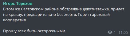 11:10 В Салтовском районе Харькова снаряд попал в крышу девятиэтажки, горит гаражный кооператив, сообщил мэр города Игорь Терехов.