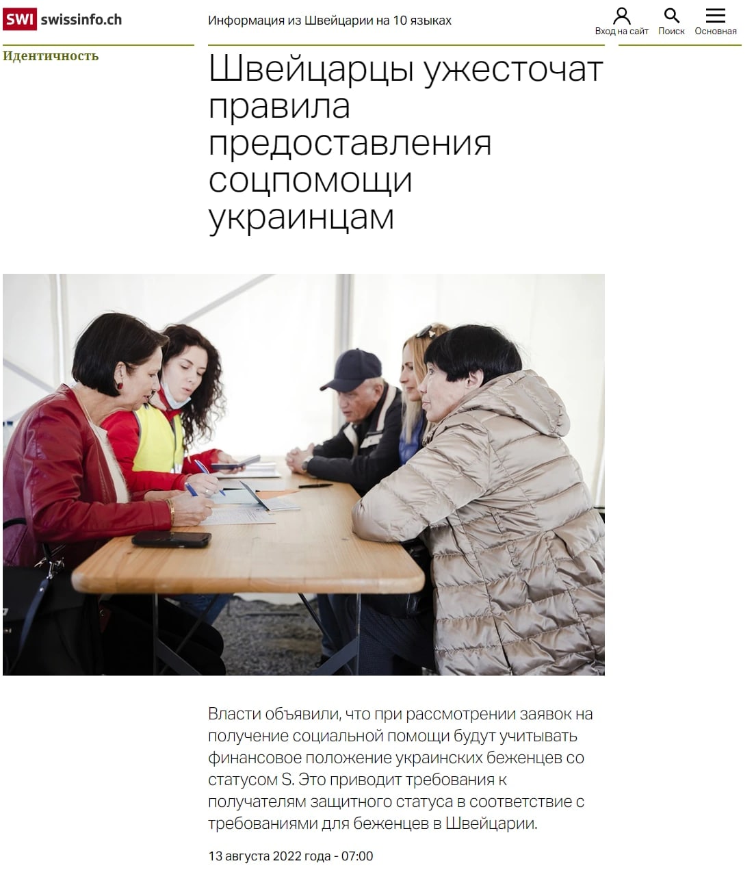 11:30 Власти Швейцария при оформлении выплат для беженцев будет учитываться финансовое положение украинцев, пишет SwissInfo.