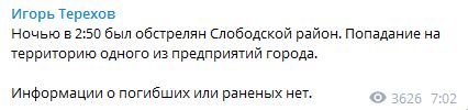 07:10 Ночью обстреляли Харьков, сообщил мэр города Игорь Терехов.