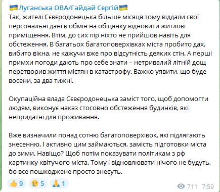 08:08 Жители захваченного Россией Северодонецка больше месяца назад отдали свои персональные данные в обмен на обещание восстановить жилые помещения. Но до сих пор никто не пришел даже для обследования.