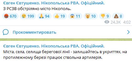 "Из РСЗО обстрелян город Никополь", – написал Евтушенко в своем Теlegram-канале около 4 утра.