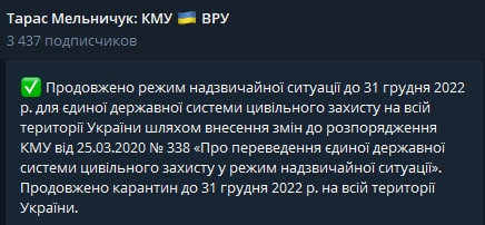 "Продлен режим чрезвычайной ситуации до 31 декабря 2022 года для единой государственной системы гражданской защиты по всей территории Украины путем внесения изменений в распоряжение КМУ от 25.03.2020 № 338 "О переводе единой государственной системы гражданской защиты в режим чрезвычайной ситуации". Продлен карантин до 31 декабря 2022 года на всей территории Украины", - написал он.