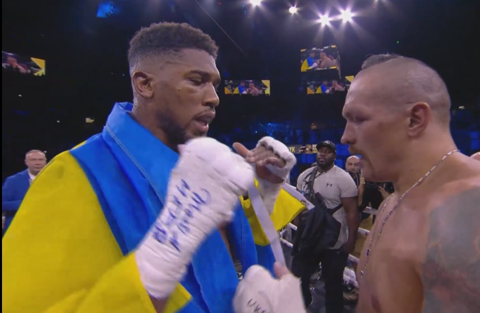 В своей длинной речи после боя Джошуа заявил, что в Украине есть чемпионы, несмотря на войну. А Усик поблагодарил Бога и ВСУ.