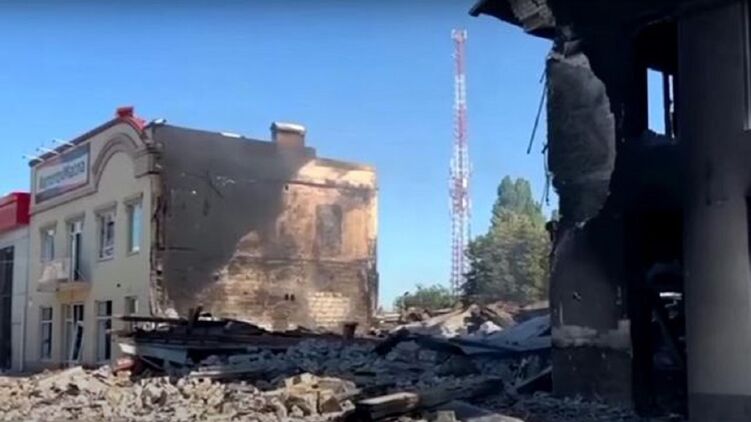 Еще в июле "власти" временно оккупированной Новой Каховки заявляли, что ВСУ уничтожили половину города. Скриншот видео