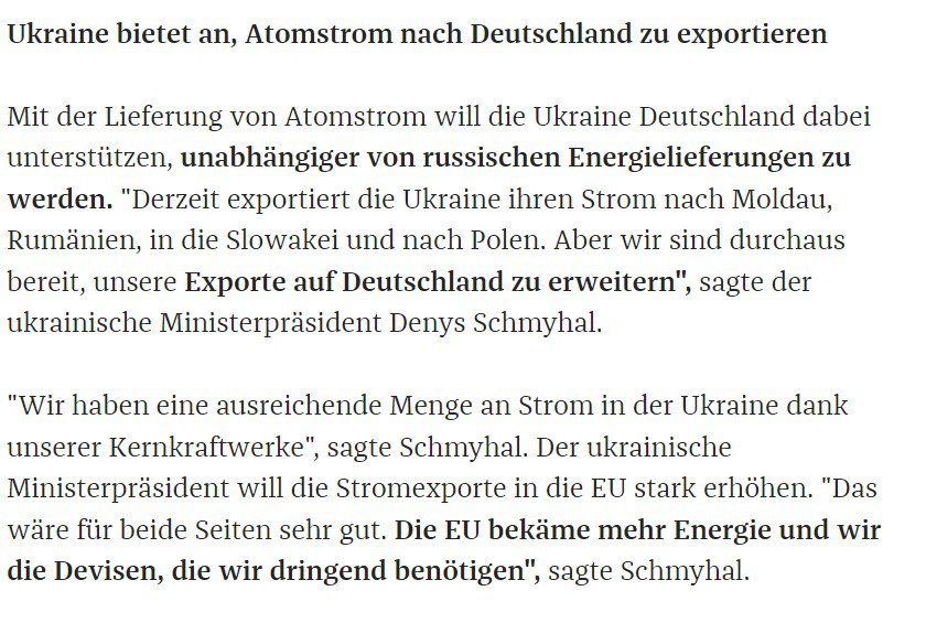 Премьер-министр Денис Шмыгаль заявил о желании Украины экспортировать ядерную электроэнергию в Германию, чтобы помочь ей стать менее зависимой от поставок энергоресурсов из России.